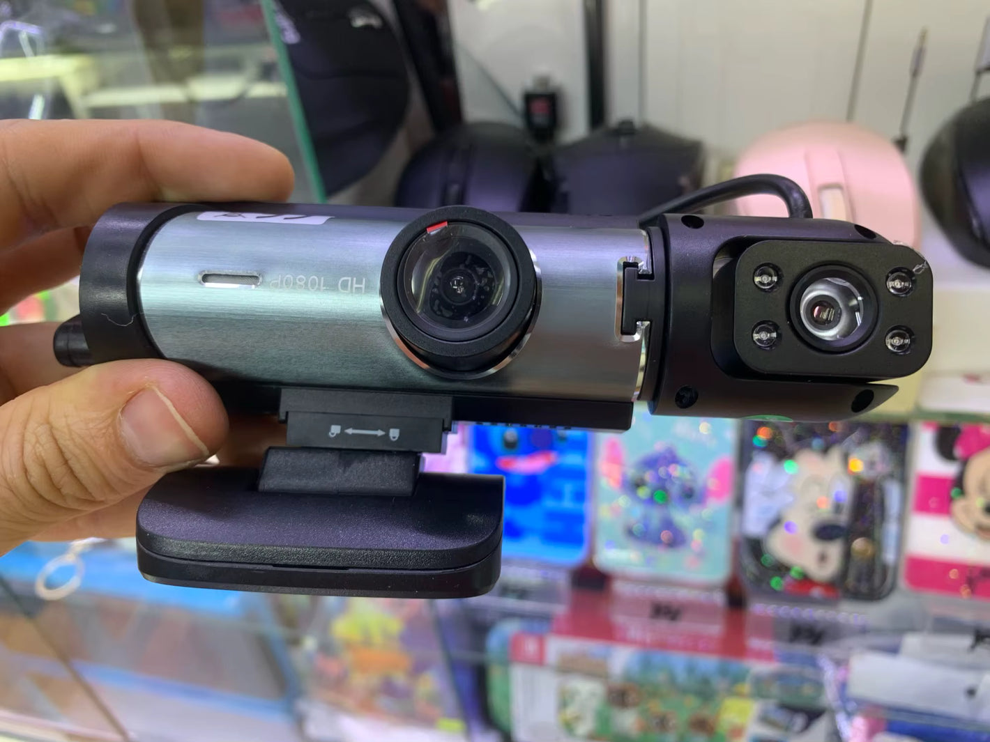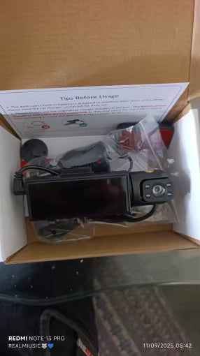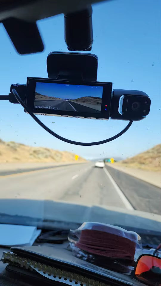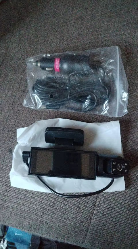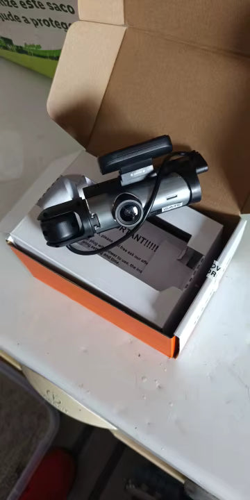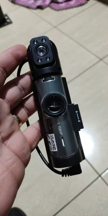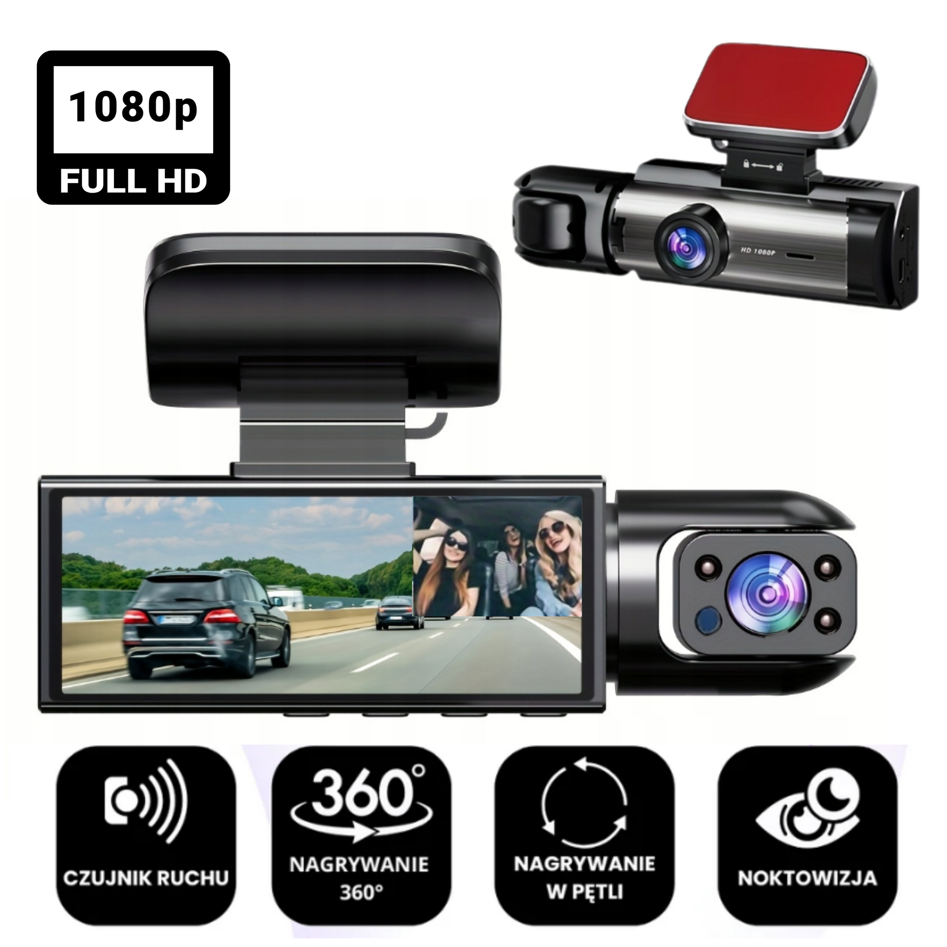 Tak, kamerka posiada dwa obiektywy i rejestruje obraz z przodu oraz z wnętrza kabiny jednocześnie.